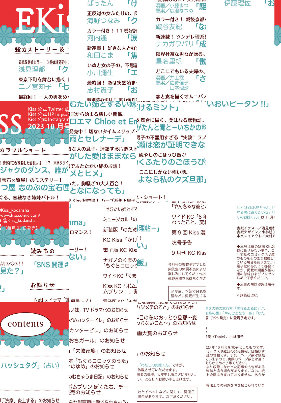 大型新連載がスタート!好きな人と好きな人の息子、連鎖する歳の差片恋ストーリー『焦がした愛はままならない』(和田こま)&ツンデレ系理系男子の不器用すぎる”実験”ラブ!アプリPalcyでも連載中の『成瀬は恋が証明できない』(ナカガワパリ)。この2つの新連載!見逃せません!! 大人気連載の2つ『おとなになっても』(志村貴子)&『けむたい姉とずるい妹』(ばったん)がダブルで最終回!それぞれの恋がどんな結末を迎えるのかをぜひ見届けてください! 『けむたい姉とずるい妹』は10月からのスペシャルなお知らせも発表されているのでお見逃しなく!! そして実力派作家の読切も登場。Kiss初登場!小藤まつ(漫画)・広瀬なつめ(原案)のハーブ系年下男子との同居ラブが繰り広げられる『駆けるミント』にご注目ください。 『クロエマ』(海野つなみ)、『七つ屋志のぶの宝石匣』(二ノ宮知子)、『クジャクのダンス、誰が見た?』(浅見理都)、『ながたんと青と-いちかの料理帖-』(磯谷友紀)など、見逃せない人気作が一挙掲載です。 話題沸騰中のKiss10月号をお楽しみに♪ 【*「Kiss」の電子版「EKiss」には付録、プレゼントページは付きません。ご了承ください】