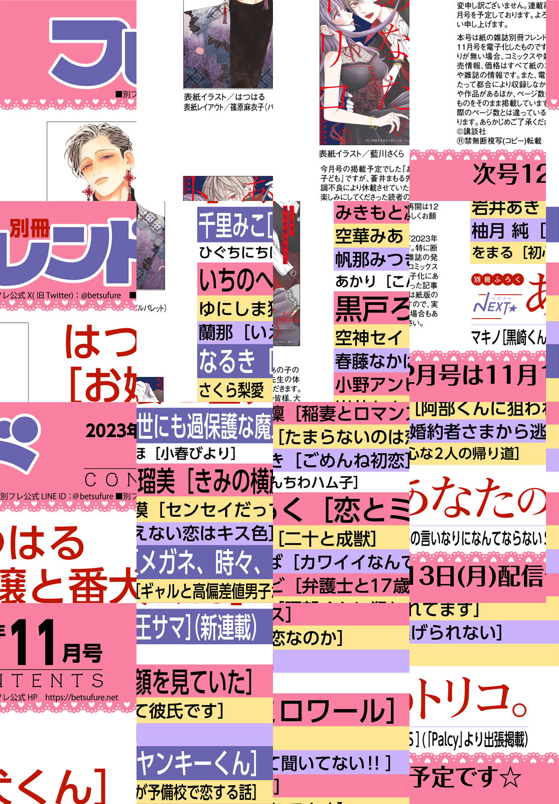 別フレ11月号(2023年)は、TVアニメ好評放送中の『お嬢と番犬くん』(はつはる)が表紙&巻頭カラーで登場! アニメの主演声優・一咲役の鬼頭明里さん&啓弥役の梅原裕一郎さんの2ショット撮りおろしグラビアインタビューも掲載☆ 『きみの横顔を見ていた』(いちのへ瑠美)は待望の連載再開!! 4人目の主人公はイケメン朝霧くん。ミステリアスな彼の胸のうちは――!? そして…あの黒崎くんが帰ってきた!! 待望の続編『黒崎くんのいいなりになんてならないS』(マキノ)が コミックス1巻発売記念として第1話がココで読めちゃいます! 別フレ11月号も見どころ満タン、フルスロットルでお届け☆