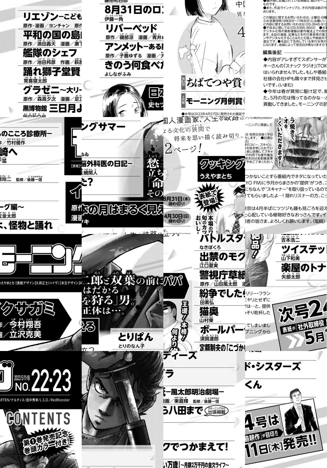◎『イクサガミ』は第1巻発売記念巻頭カラー付きで登場。愁二郎と双葉の前に立ちはだかる「命を狩る」男。その正体は…。 ◎『クッキングパパ』は表紙で登場。王道! 本格! 何より絶品! 本場のワラ焼きで、旬のカツオをおいし~くいただきます! ◎『日本の月はまるく見える』は読み切りで登場。中国人漫画家、人生の岐路に立つ。異なる文化の狭間で将来を思い描く読み切り、42ページ! ※作品ラインナップは、紙の「モーニング」に準拠しておりますが、一部、異なる場合があります。