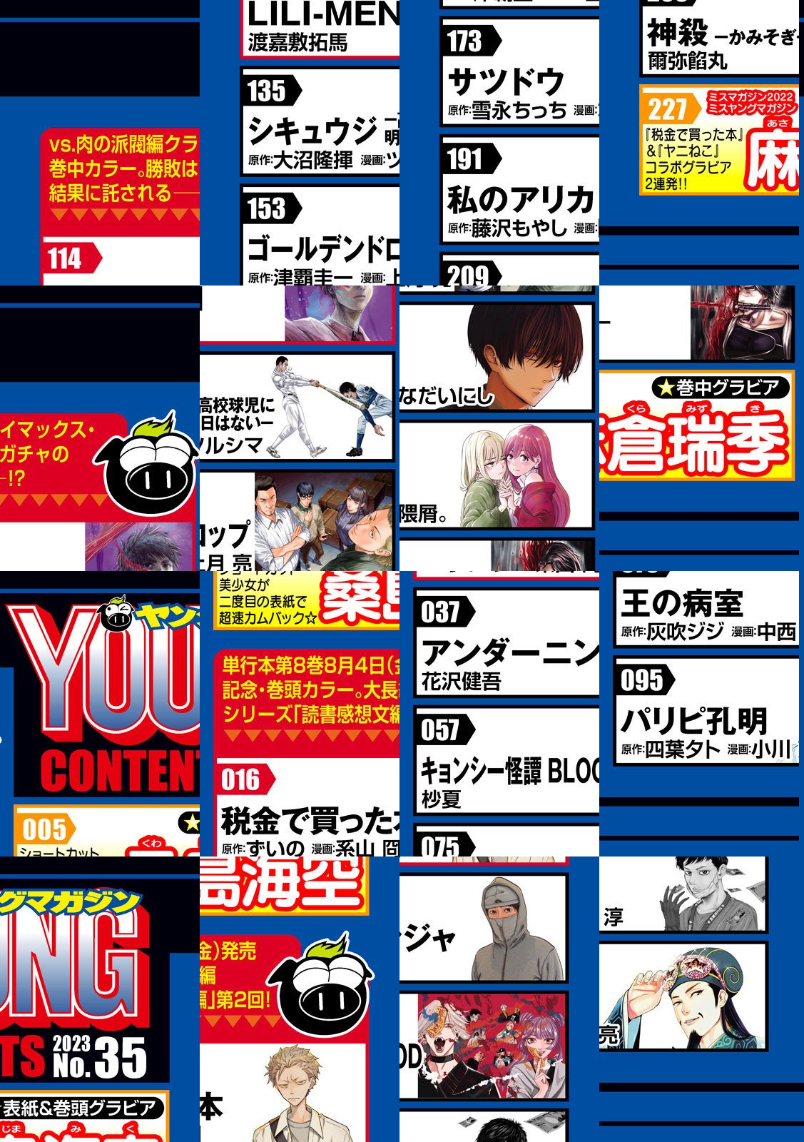【巻頭カラー】『税金で買った本』話題の大長編シリーズ「読書感想文編」第2回!謎のVtuber、ぱーんちゃんからの試練に石平くん、どうするどうする??【巻中カラー】『LILI-MEN』vs.肉の派閥編クライマックス!!ビッグダディチルドレン三男フキ対マルサ隊長春日!!!勝敗はガチャの結果に託される――!?【巻中カラー】『何度、時をくりかえしても本能寺が燃えるんじゃが!?』祝!! 100“変”突破!!本能寺、まだまだ燃え続けます!!助っ人キャラはラスボス光秀!?シン・川中島決戦、正念場!〈表紙・巻頭グラビア〉「桑島海空」大・大・大反響!!ショートカット美少女が超速カムバック☆〈巻中グラビア〉「麻倉 瑞季」あしゃくの魅力が大爆発!!ヤンマガの優等生『税金で買った本』とヤンマガの劣等生(笑)『ヤニねこ』のコラボグラビア2連発!!〈巻末グラビア〉「ちばひなの」大阪で見つけた超逸材☆フレッシュ水着でヤンマガに初登場☆