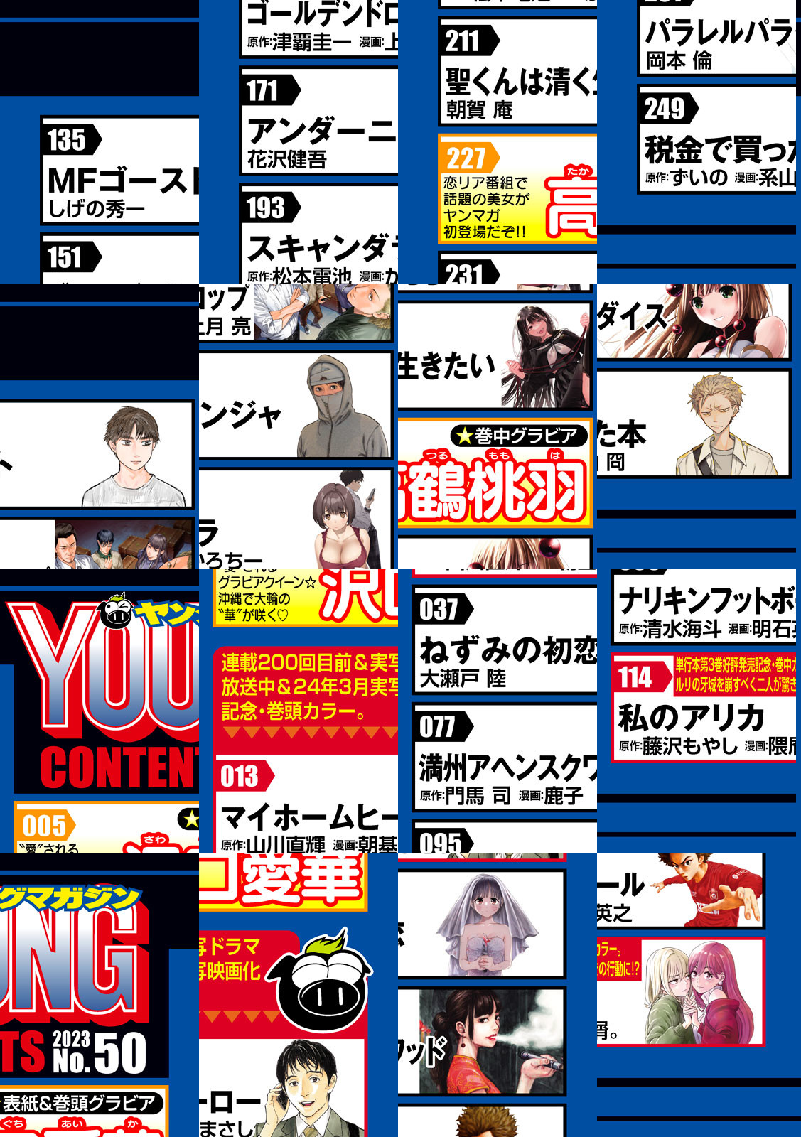 【巻頭カラー】『マイホームヒーロー』実写ドラマ放送中&24年3月実写映画化!宿敵“窪”はすでに死んでいた。呆然とする零花のもとに、哲雄からの着信がーー。連載200回目前、巻頭カラー!!【巻中カラー】『私のアリカ』3期生オーディション編クライマックス!“りりトリ”を支配するルリの牙城を崩すべくあの二人が驚きの行動に!?【巻中カラー】『サツドウ』P・3軍のリーダー、ジェームズ・オウルとの決戦!六男は大切な後輩を救うことができるのか・・・・!?〈表紙&巻頭グラビア〉「沢口愛華」“愛”される理由(わけ)がココにある!グラビア女王の「イマ」をたっぷりお届け!〈巻中グラビア〉「高鶴桃羽」ABEMAの恋リア番組でデビューした話題の美女がヤンマガ初登場!〈巻末グラビア〉「PyunA.」超イマドキGALがヤンマガ初登場!!抜群のスタイルに釘付け間違いナシっしょ☆