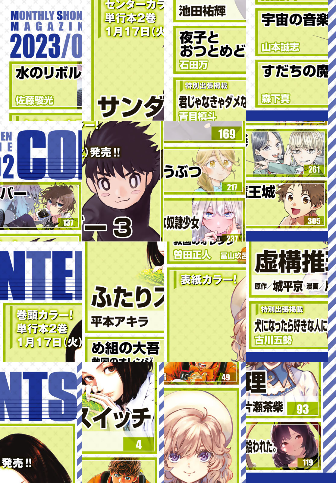 2023年はアニメ化祭り! 『月マガ』2023年2月号1月6日発売!! ☆表紙カラーは『虚構推理』!! 怪異に恋に、今年は大忙し! TVアニメシーズン2、1/8(金)スタート!! ☆巻頭カラー、入れ替わりが元に戻ったコメディ! 『ふたりスイッチ』!! 単行本最新第2巻1月17日発売!!☆ 驚愕のSF、センターカラー『サンダー3』!! 単行本最新第2巻1月17日発売!! ☆TVアニメ化決定! 救助隊員たちの青春『め組の大吾 救国のオレンジ』!! ☆出張掲載『犬になったら好きな人に拾われた。』も1月アニメスタート!! 2023年『月マガ』の進撃を見逃すな!!
