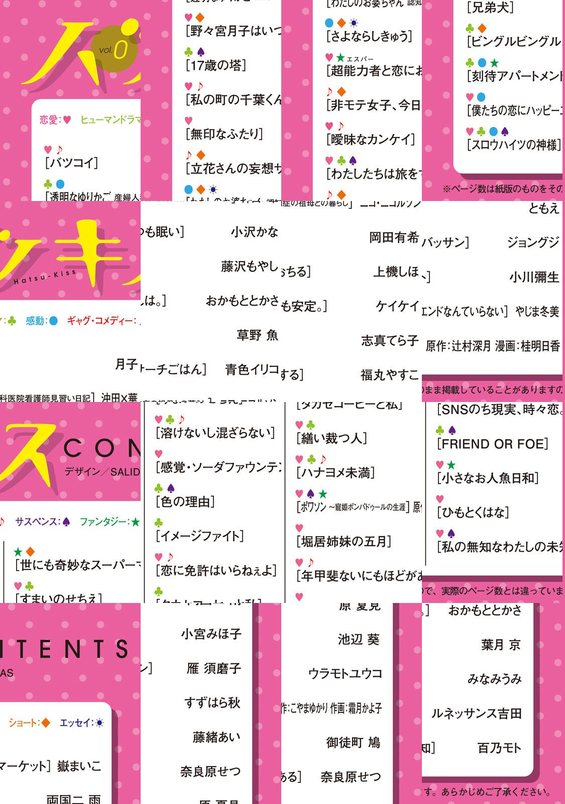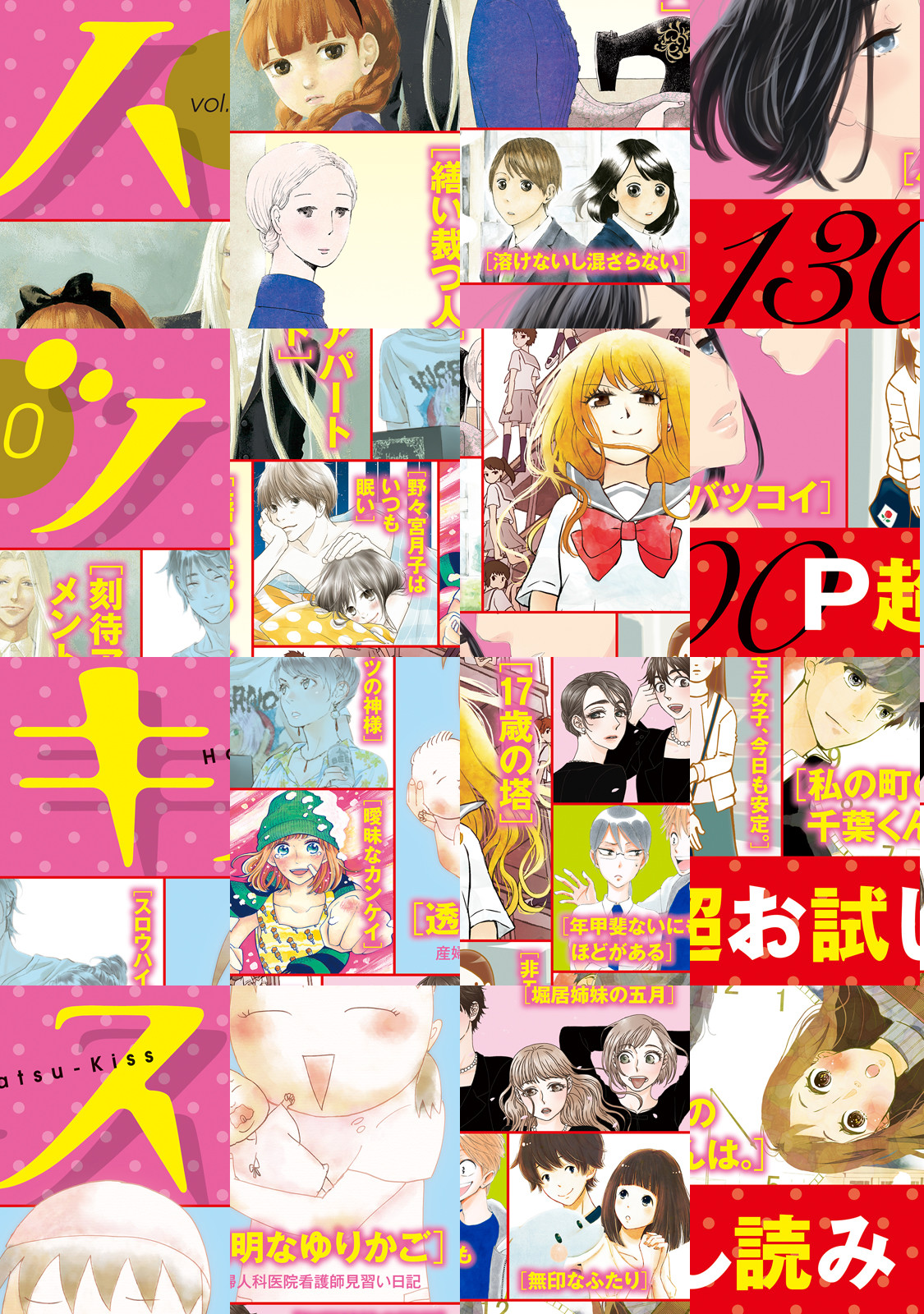 完全無料!全36作品、総ページ1300超の大ボリュームでお届けします!ハツキス・プチキスレーベルの1話目を集めた特別編集版「ハツキス」。『透明なゆりかご』『繕い断つ人』『17歳の塔』など話題の漫画ばかり。これを読んで、お気に入りの作品を見つけてください!