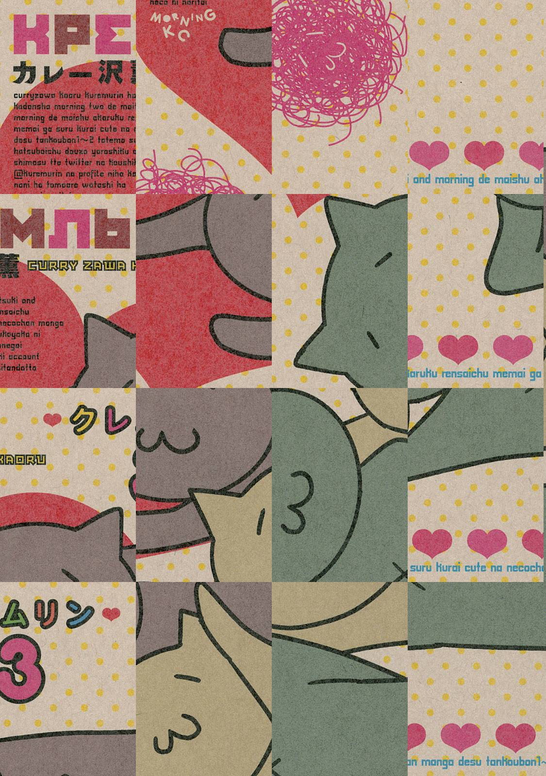 日本のどこかの道ばたにロシアンブルーがすてられていました。出会いをまちわびるうち、捨て猫は三びきにふえていました。だれも彼らをひろってくれません。ところが神様は猫たちを決してみすてませんでした。猫耳の帽子をかぶった無気力で無表情でブラブラしている若者が、三びきの新しい同居人、あるいはお父さんとなったのです。若者の名前は却津山春雄(きゃつやまはるお)、通称・キャッツ。捨て猫たちと若者の熱い友情がきっとみなさんの胸をうつことでしょう。ご家族そろってどうぞ『クレムリン』を応援してください。 【あらすじ】大学生という名の無職・却津山春雄は道ばたに捨てられていたロシアンブルーを無慈悲にも黙殺するが,小さな命は『南極物語』のタロ・ジロさながらにたくましく一冬を耐え抜いたのであった。却津山は猫三匹との同居を決意。強くしたたかに生きてほしいとの願いを込め、歴史上の英雄にあやかり、総称「関羽」と命名する。度重なる挫折のために深く絶望した却津山の魂は少しずつ癒され……。
